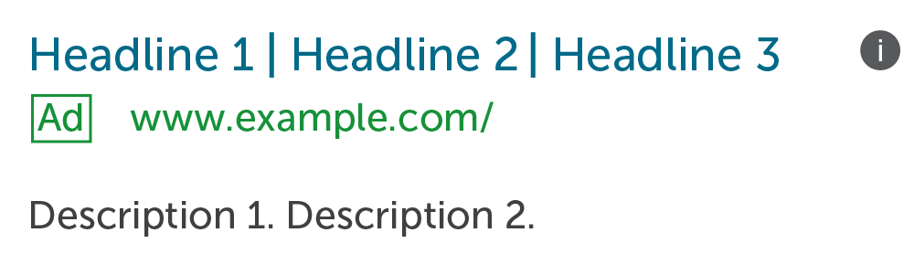 Responsive Search Ads allow you to write up to 15 headlines and 4 descriptions. Google will then optimize each ad by showing the headlines and descriptions that are likely to perform the best. Responsive Search Ads will look similar to Expanded Text Ads, with up to 3 headlines and 2 descriptions displayed (ad extensions can also be displayed). The Ad Strength rating provided by Google is a good metric to use when you’re working to improve your RSAs. Always try to get your Ad Strength to “Excellent” by adding more relevant headlines and descriptions.