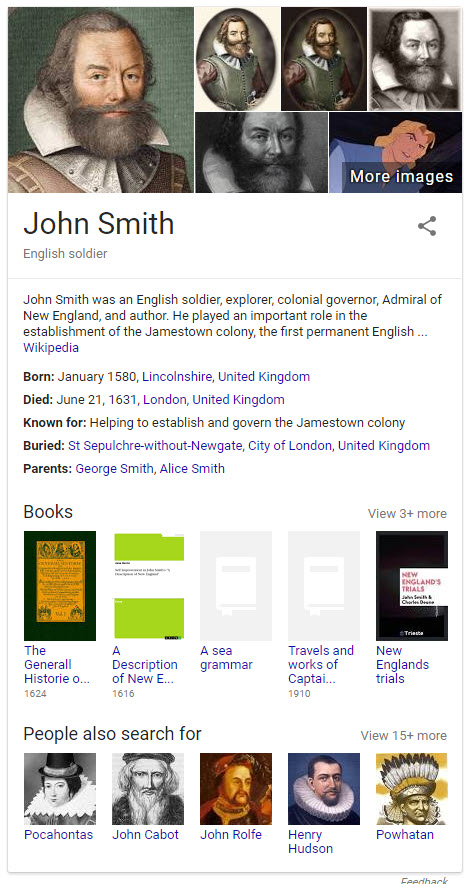 When Wikipedia has an entry about more than one person with the same name, it contains “disambiguation” information. In addition to the person’s name, it may contain other terms to identify which person is being referred to. In the case of John Smiths, I am writing about, that may be: