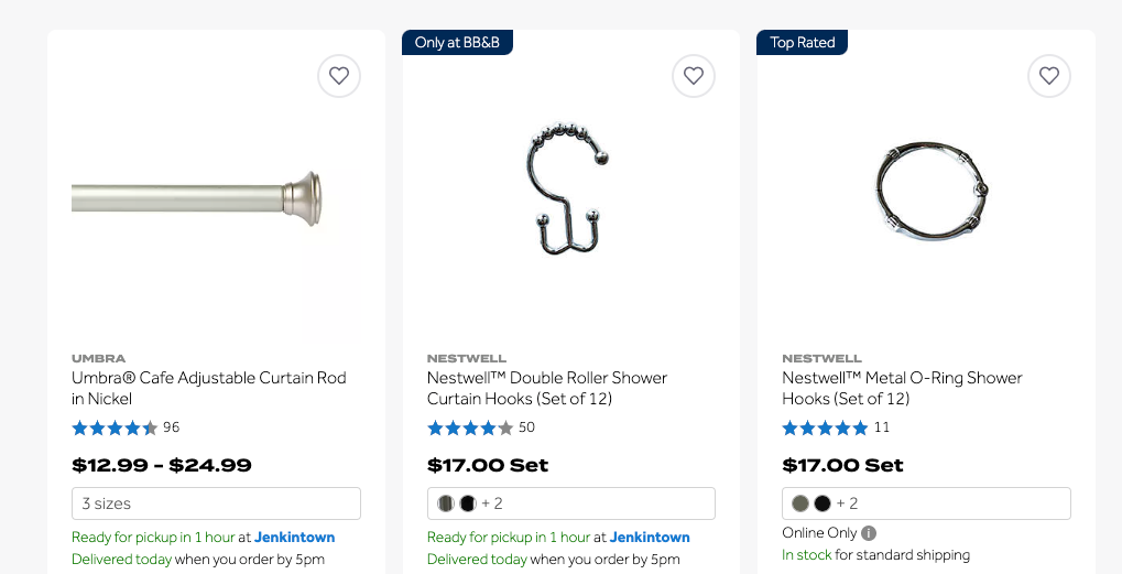 Depending on product categorization, these search pages frequently return products that are not actually relevant to the core topic. For instance, the Bed Bath and Beyond page ranking for “shower curtain rods” has many shower hook products that wouldn’t be helpful to the end user.