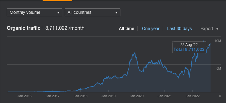Here you can see the immense power of a strong domain at work. In a very short amount of time, they’ve been able to amass huge quantities of traffic despite not having a topically relevant site.