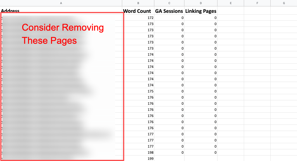 5. Clean up your sheet. Remove images/JS/CSS and only keep the columns of “Address”, “Word Count” and your traffic and backlink data