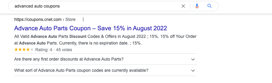 For instance, CNET is primarily a tech news site. However, they’ve created an entire subdomain (coupons.cnet.com) that’s dedicated solely to aggregating coupon deals. Currently, this site performs exceptionally well for many coupon terms such “advanced auto coupons”.