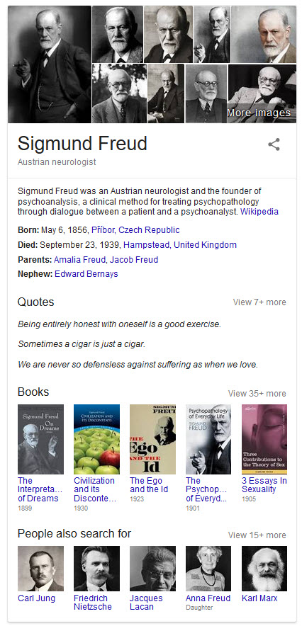 One of the things that caught my attention was how quotes were scored for ranking. I thought it was worth sharing. I also looked around to see if I could see examples of the use of quotes by Google, and noticed that in some knowledge panels, like this one from Sigmund Freud, there were several quotes, and an option to click on a link and see more quotes as well. So it seems like Google is not only interested in showing us information about entities, but also about things that they may have said in the past.