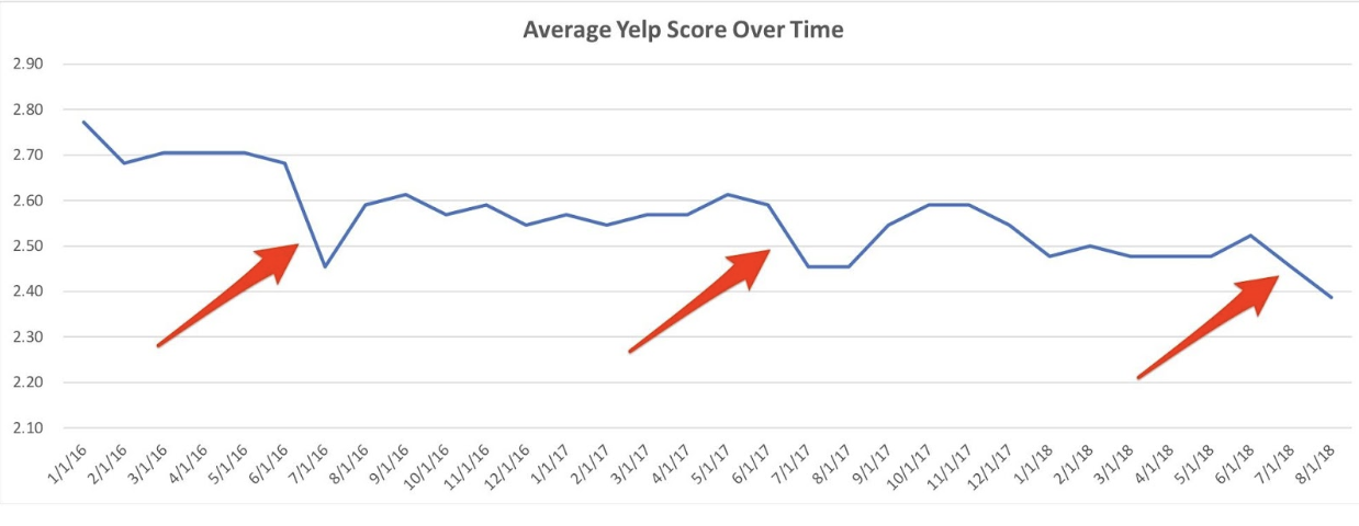 At the top of each Yelp page, viewers have the option to see a backlog of the business’ overall scores over time. By pulling this information and stringing it together, we can get an average trendline for these gyms.