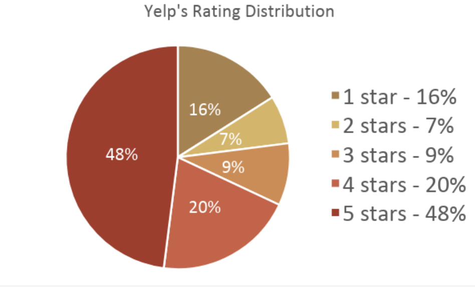 In our experience, the vast majority of businesses with multiple locations have an overall review distribution in the shape of an upside-down bell curve: lots of reviews with one and five stars, some fours, and very few twos and threes. Yelp data backs this up. If a customer is feeling motivated to leave a review, they’re likely passionate one way or the other.